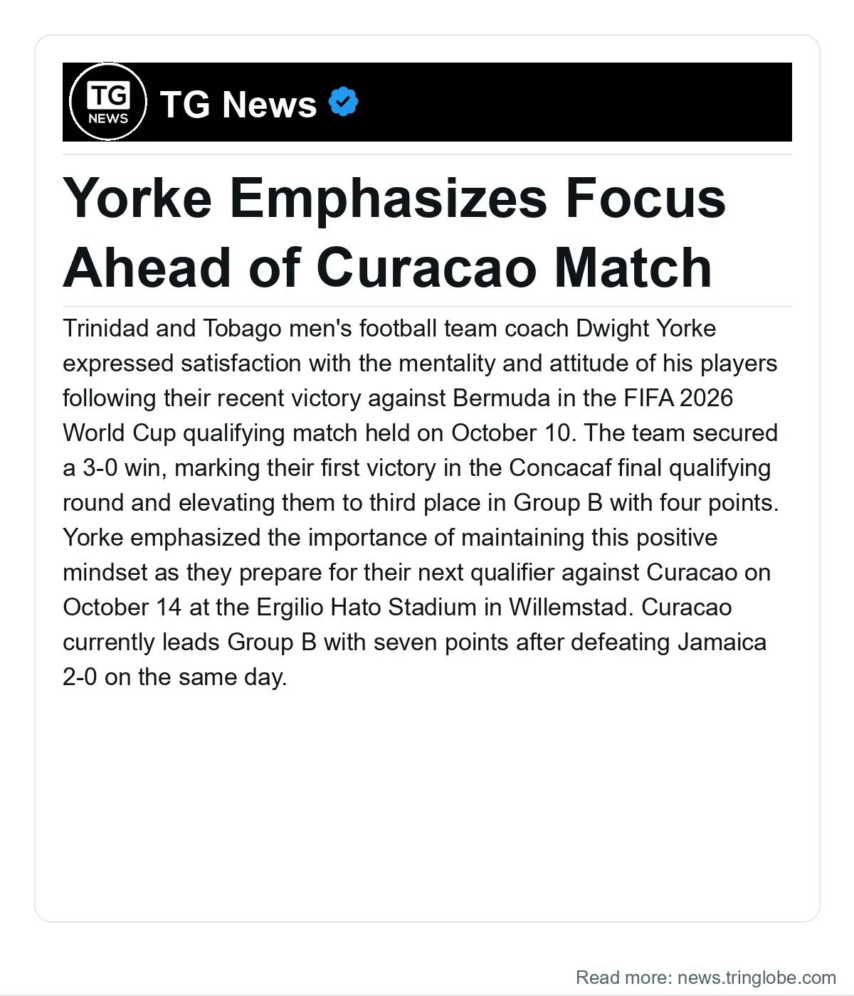 Trinidad and Tobago men’s football team coach Dwight Yorke expressed satisfaction with the mentality and attitude of his players following their recent victory against Bermuda in the FIFA 2026 World Cup qualifying match held on October 10. The team secured a 3-0 win, marking their first victory in the Concacaf final qualifying round and elevating them to third place in Group B with four points.