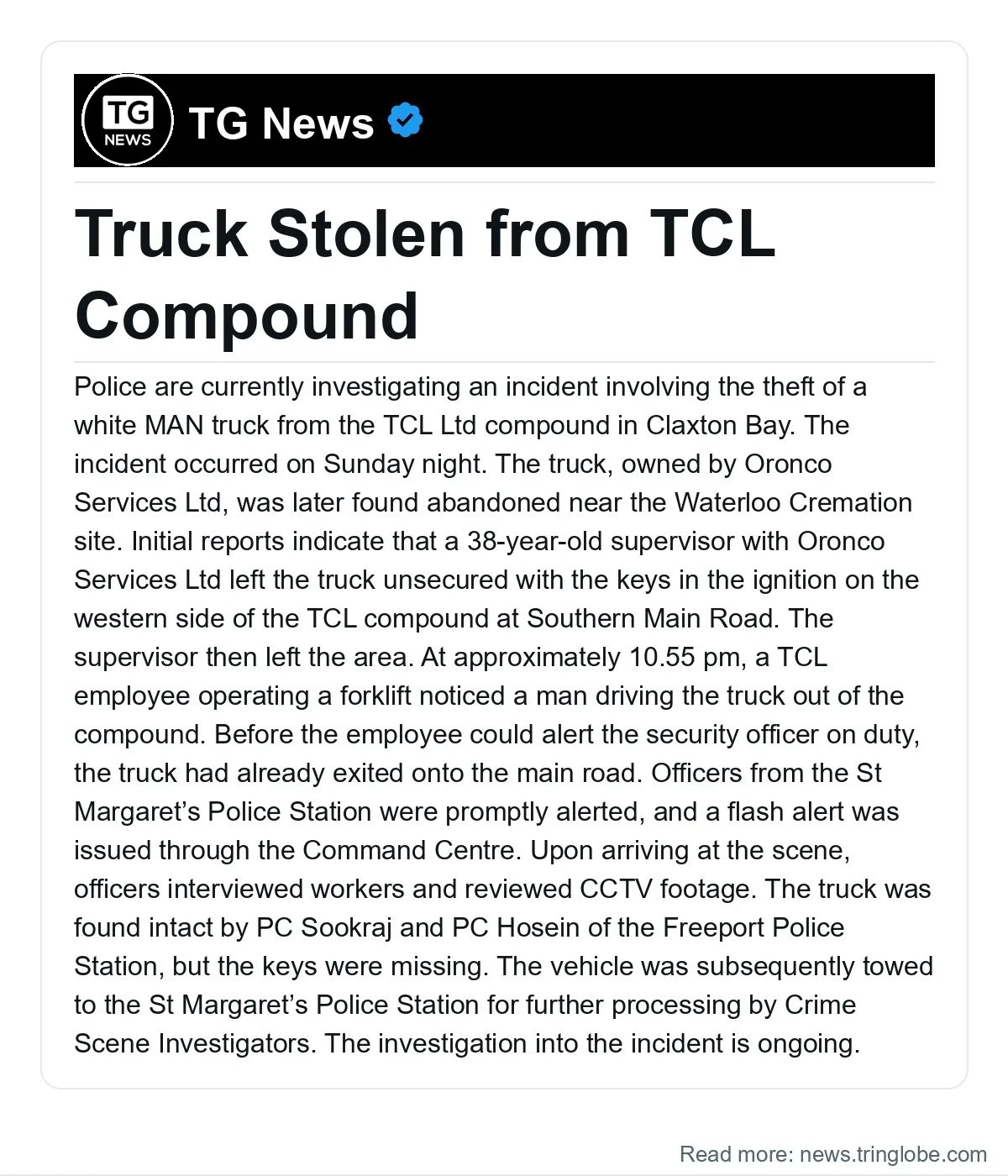 Police are currently investigating an incident involving the theft of a white MAN truck from the TCL Ltd compound in Claxton Bay. The incident occurred on Sunday night. The truck, owned by Oronco Services Ltd, was later found abandoned near the Waterloo Cremation site. Initial reports indicate that a 38-year-old supervisor with Oronco Services Ltd left the truck unsecured with the keys in the ignition on the western side of the TCL compound at Southern Main Road. The supervisor then left the area. At approximately 10.55 pm, a TCL employee operating a forklift noticed a man driving the truck out of the compound. Before the employee could alert the security officer on duty, the truck had already exited onto the main road. Officers from the St Margaret’s Police Station were promptly alerted, and a flash alert was issued through the Command Centre. Upon arriving at the scene, officers interviewed workers and reviewed CCTV footage. The truck was found intact by PC Sookraj and PC Hosein of the Freeport Police Station, but the keys were missing. The vehicle was subsequently towed to the St Margaret’s Police Station for further processing by Crime Scene Investigators. The investigation into the incident is ongoing.