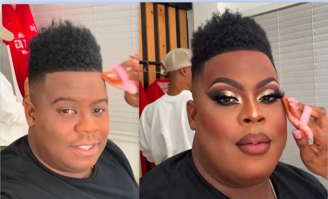 Vikingdingdong has made a stunning transformation, moving from a clean, fresh fade to a striking full glam look. This new appearance showcases bold, high-definition makeup that captures attention. Key features of the look include sharply defined brows and dramatic eyeshadow enhanced with shimmering gold highlights, which together create a vibrant and captivating aesthetic.
