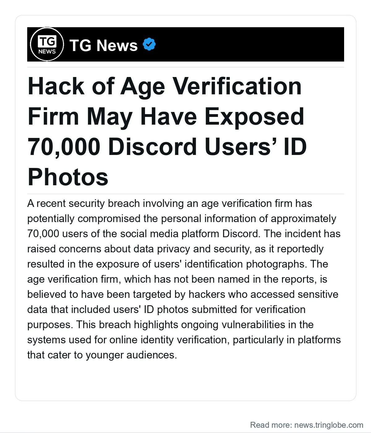 A recent security breach involving an age verification firm has potentially compromised the personal information of approximately 70,000 users of the social media platform Discord. The incident has raised concerns about data privacy and security, as it reportedly resulted in the exposure of users’ identification photographs.